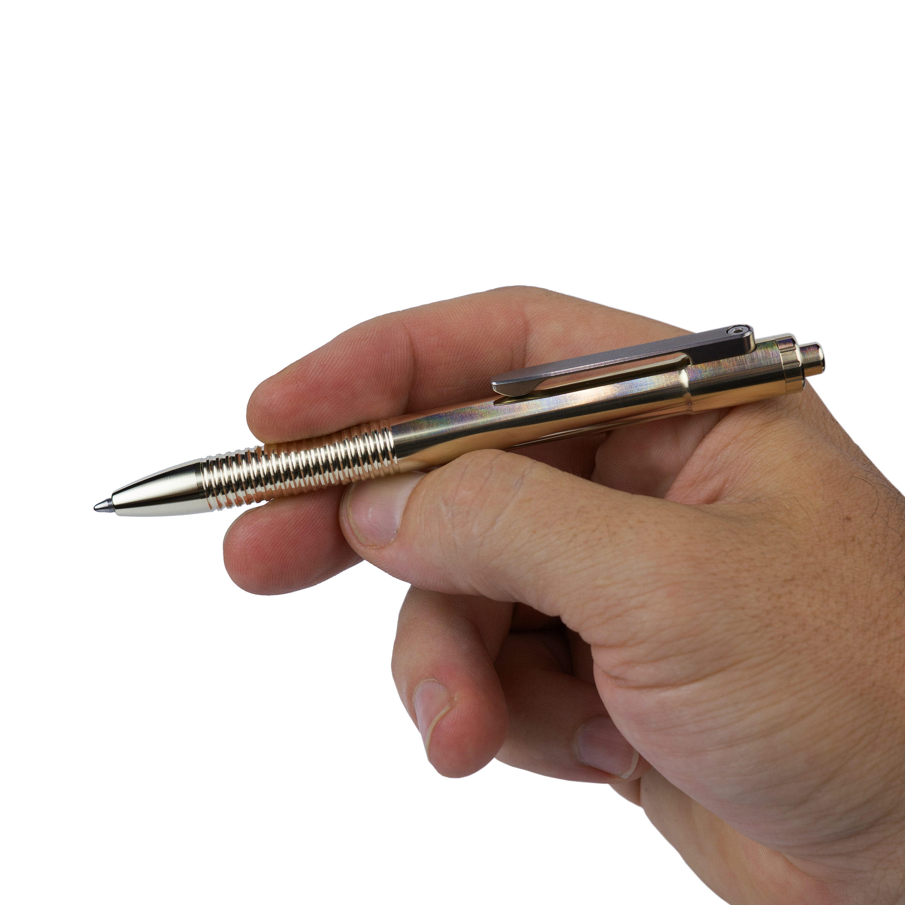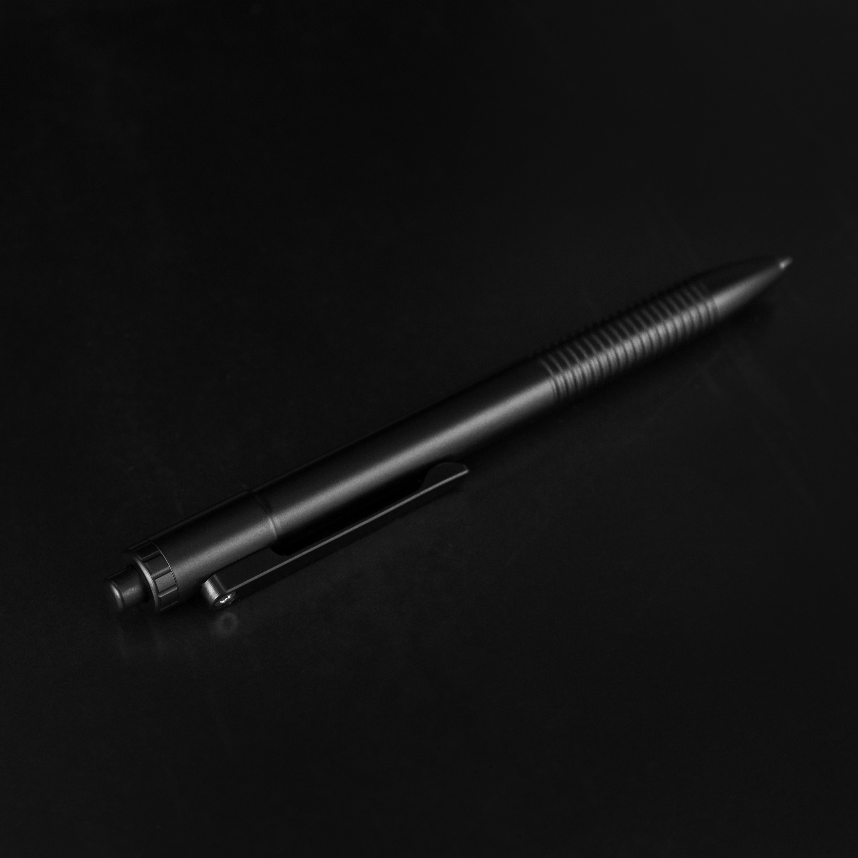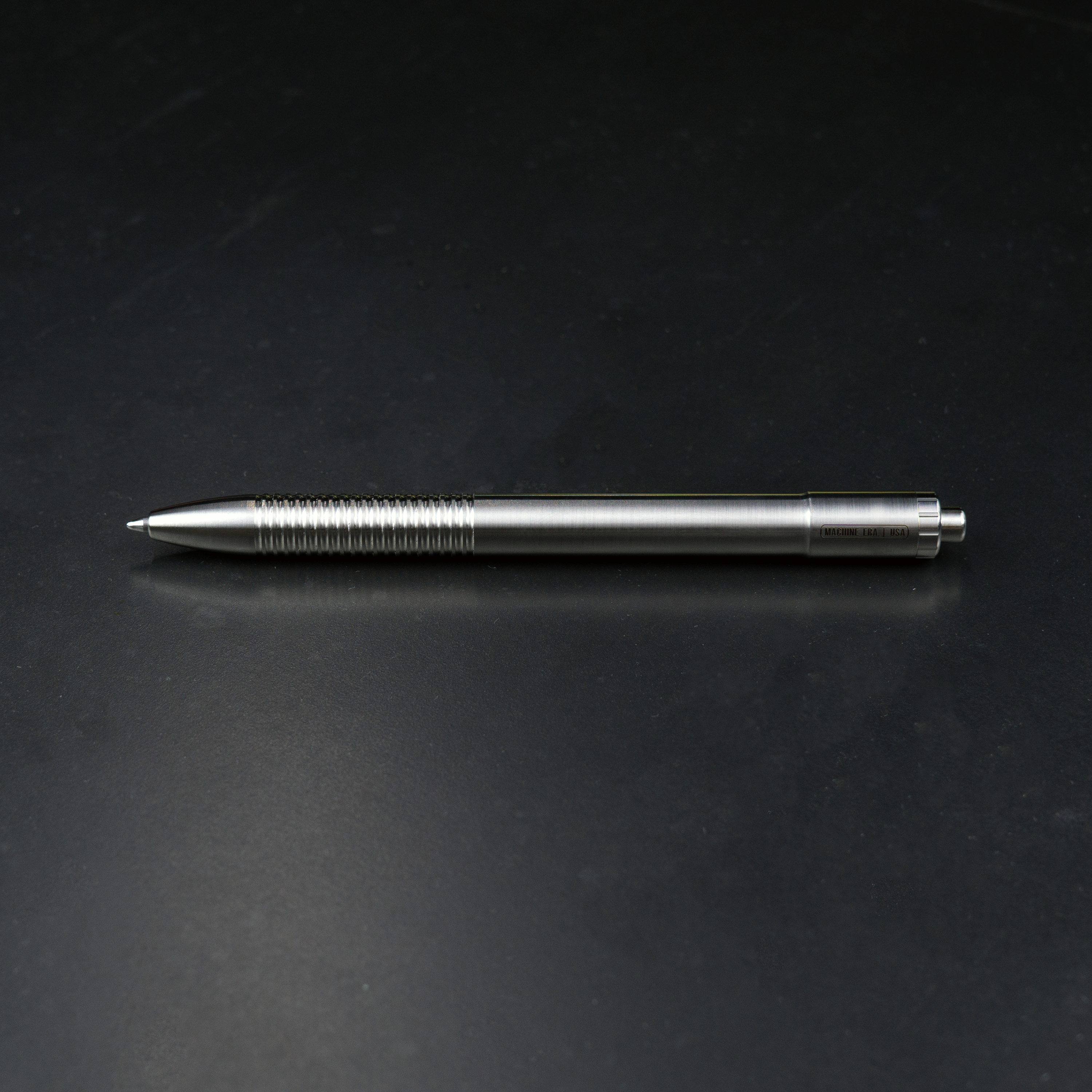 Machined from solid bar, it lays at the intersection of aerospace parts and precision tooling. After a year of design and prototyping, we've got a design that is up to task. Perfectly balanced, and more compact than most machined pens, the unique single body design allows for maximum durability with no plastic parts. Cartridges are rear loaded and captured by a ball and channel mechanism assembly. The finger purchase is a square cut ridged pattern for maximum grip and comfort.