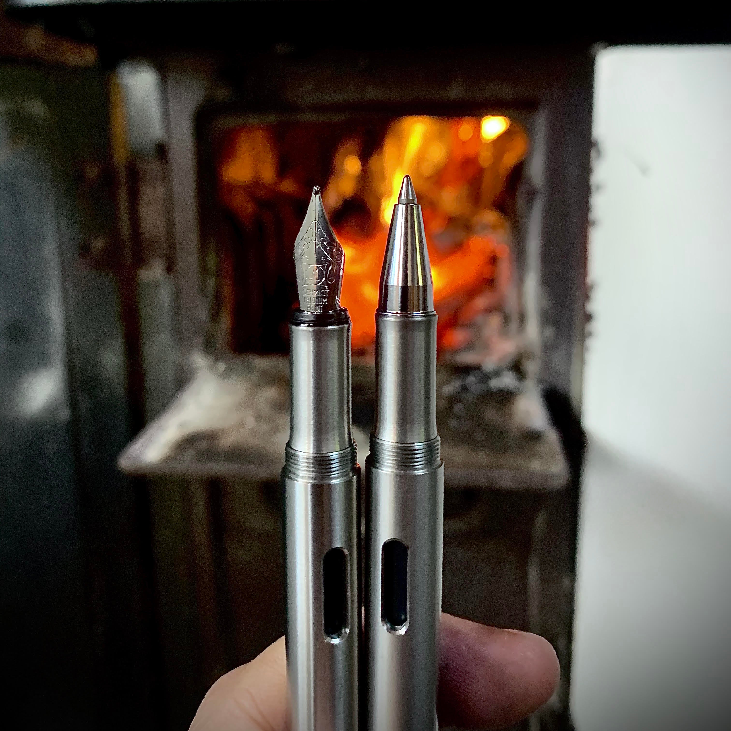 100% made by us, in our Richmond, Va shop. Designed with the first time user and the avid fountain pen collector in mind, and using Schmidt components, we've created a versatile EDC writing tool. The fountain pen nib is easily switched over to the super smooth flowing rollerball tip.