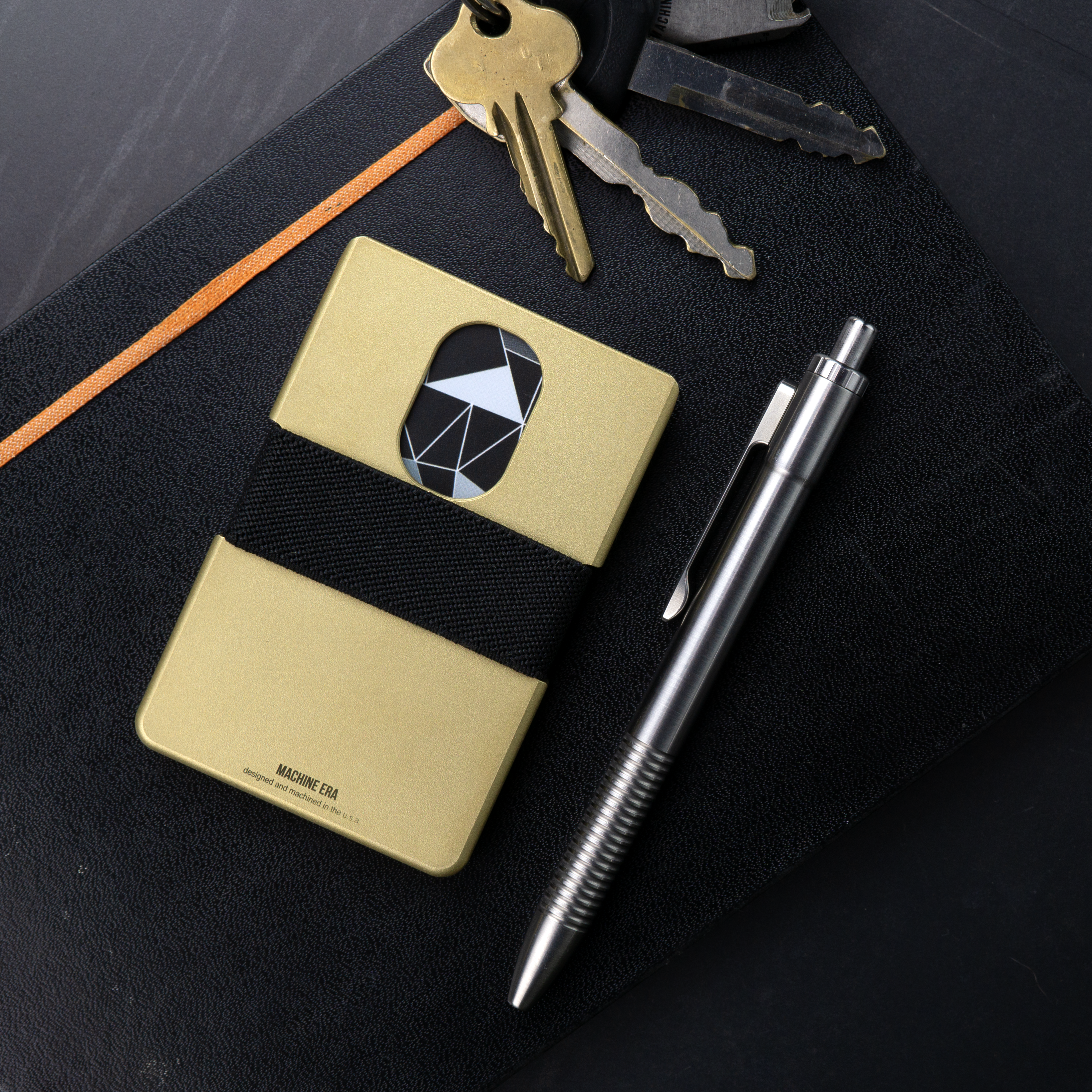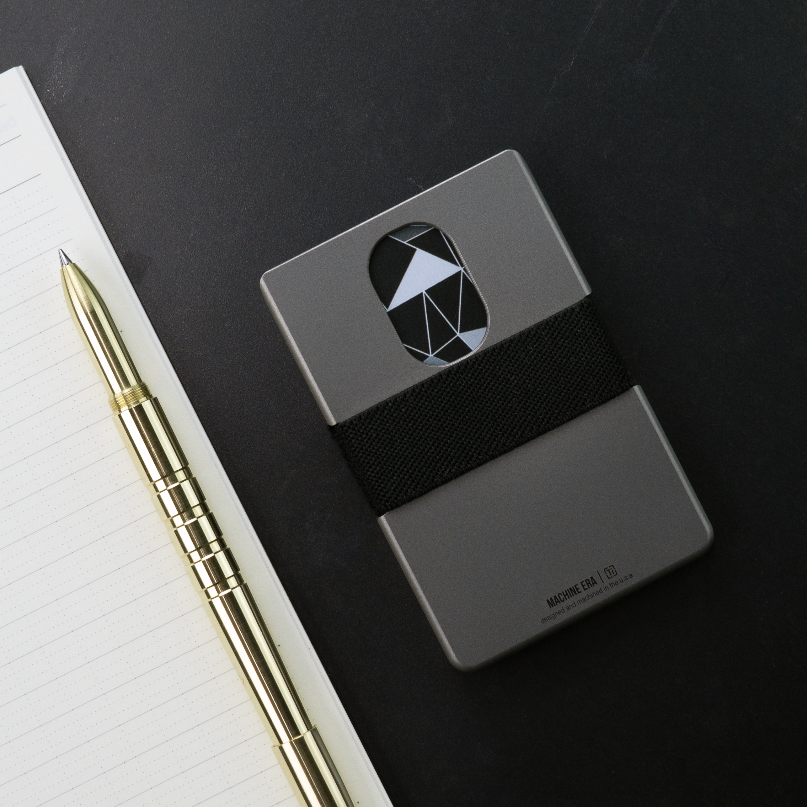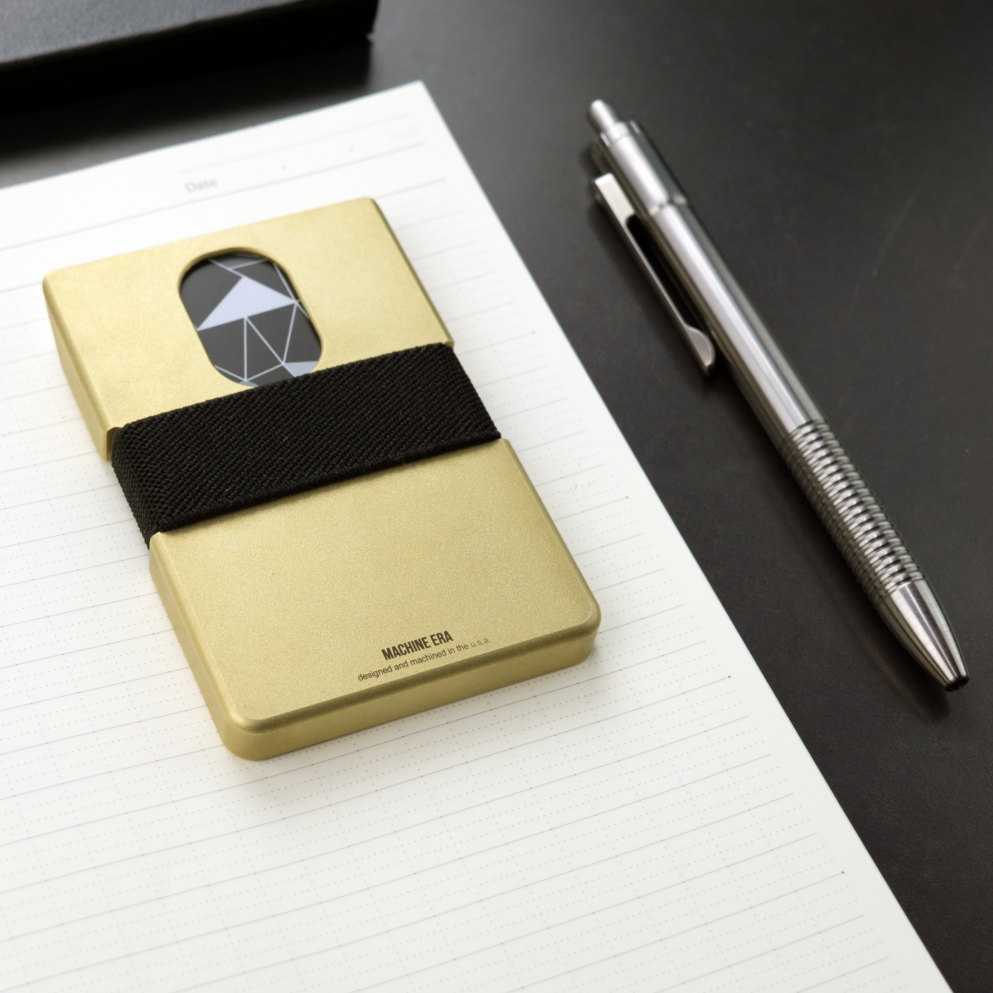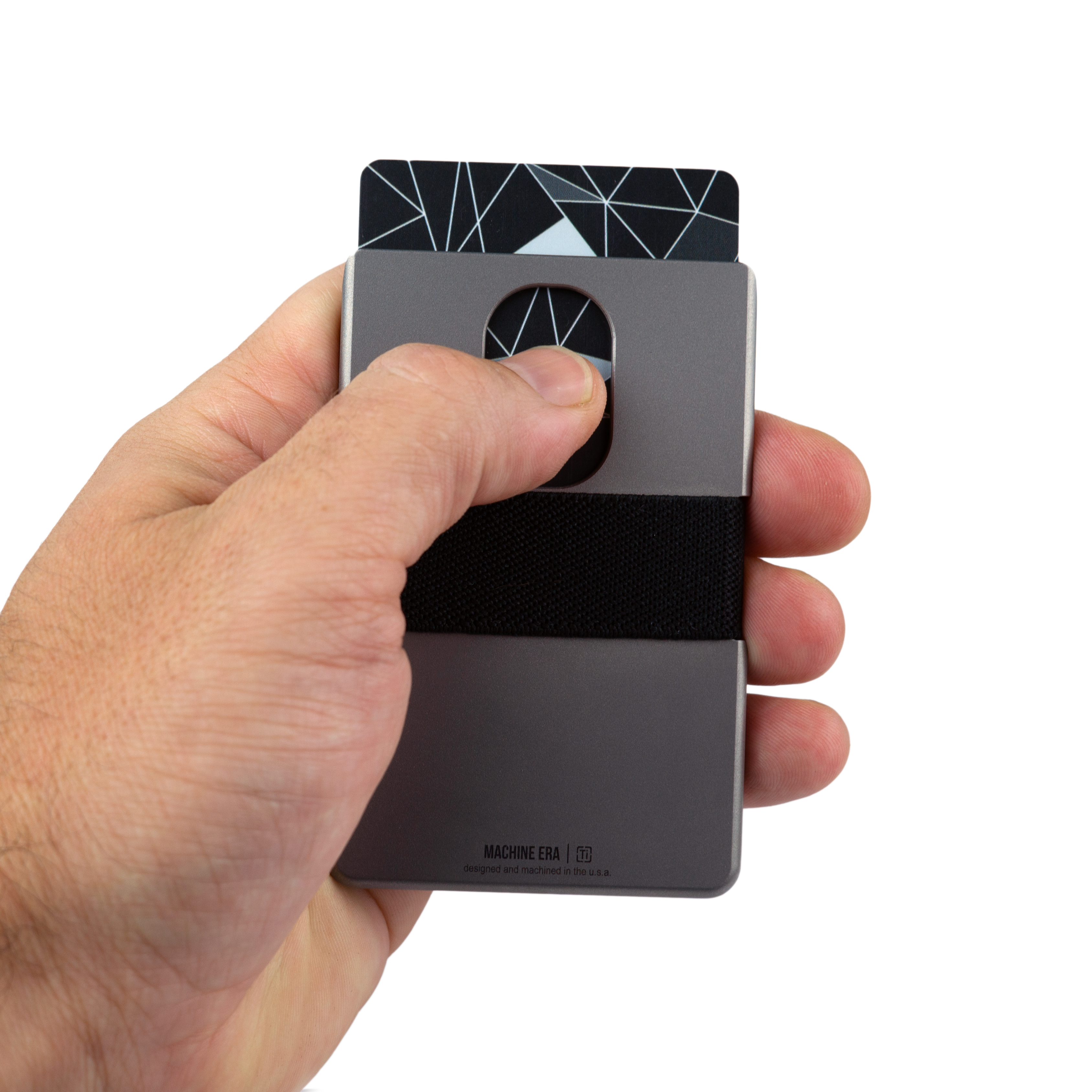 The Machine Era Wallet has built in features that make pulling cards out easy. The rear thumb slot is designed for easy access to an often used specific card, such as an ID. Side cut outs enable the user to pull back and thumb through. The wallet band that we've been using for a decade is tried and true. It allows for the right amount of tension, with ease of extraction.